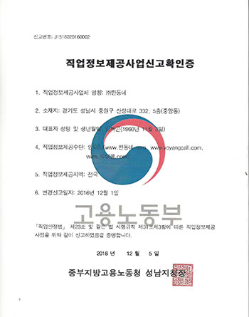 경기도 성남시 중원구 희망로 320 5층 / 대표전화 : 1644-3945 / 직업정보제공사업신고확인증 신고번호 : J1516020160002